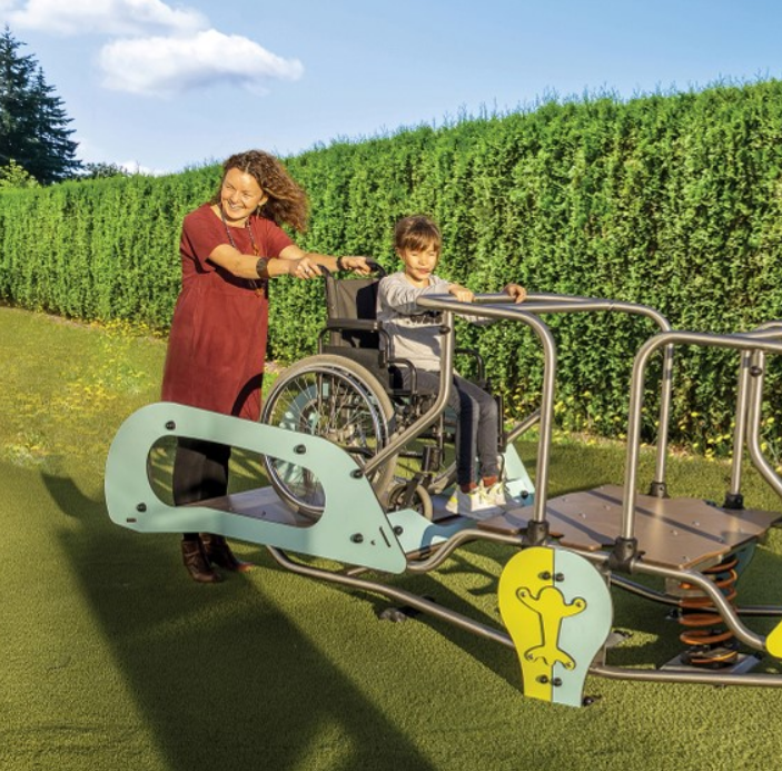 The all-terrain jeep vehicle (J952) is another example of equipment that allows a wheelchair user and up to 7 other children the opportunity to let their imaginations take them on a bouncy adventure. Additionally, the new inclusive Diabolo multiplay unit (J38201) offers 29 inclusive play activities and a ramp allowing access to a raised platform area.